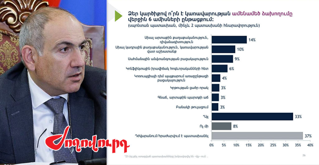 Հունիսի 16-ից 25-ը իրականացված հարցման արդյունքները ցույց են տալիս, որ վերջին 6 ամիսների ընթացքում իշխանությունների ամենամեծ ձախողումը եղել է սխալ արտաքին քաղաքականությունն ու դիվանագիտությունը՝ ըստ հարցվածների 14%-ի։