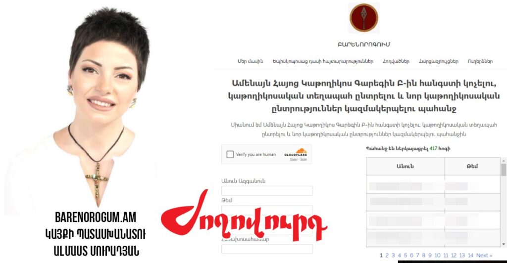 «Ժողովուրդ» օրաթերթը գրում է. «ArmLur.am-ը հայտնել էր, որ հայրենի իշխանությունները կաթողիկոսին հեռացնելու համար նոր էլեկտրոնային էջ են ստեղծել: Barenorogum.am կայքով առաջարկում են էլեկտրոնային քվեարկությամբ հավանության տալ Կաթողիկոսի հեռացման եւ եկեղեցու բարենորոգման խնդրին: