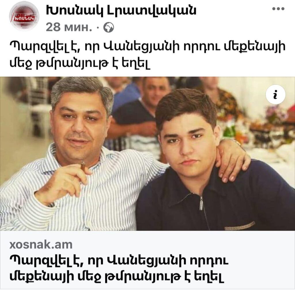 «Արտյոմ Վանեցյանի մեքենայի հետնամասին դեկտեմբերի 7-ին հարվածել է մեկ այլ անձի մեքենա՝ պատճառելով զգալի գույքային վնաս։ Այդ մեկ այլ անձի մեքենայից ոստիկանությունը հայտնաբերել է թմրանյութի նման ինչ-որ բան (երևի կպարզեն, թե ինչ է)։