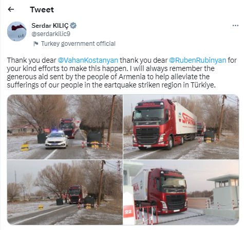 Սերդար Քըլըչը շնորհակալություն է հայտնել հայկական կողմին երկրաշարժից տուժած Թուրքիայի քաղաքացիներին ցուցաբերած օգնության համար