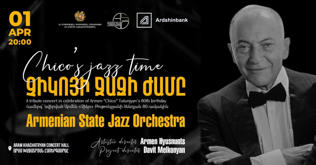 Ս.թ. ապրիլի 1-ին ժամը 20:00-ին «Արամ Խաչատրյան» համերգասրահում կկայանա Հայաստանի պետական ջազ նվագախմբի համերգը՝ նվիրված ջազմեն, թմբկահար, հանրահայտ «Չիկոն և ընկեները» ջազային խմբի հիմնադիր և ղեկավար, «Ջազի Ժամը» հաղորդաշարի հեղինակ և վարող, ՀՀ արվեստի վաստակավոր գործիչ Արմեն «Չիկո» Թութունջյանի ծննդյան 80-ամյակին: