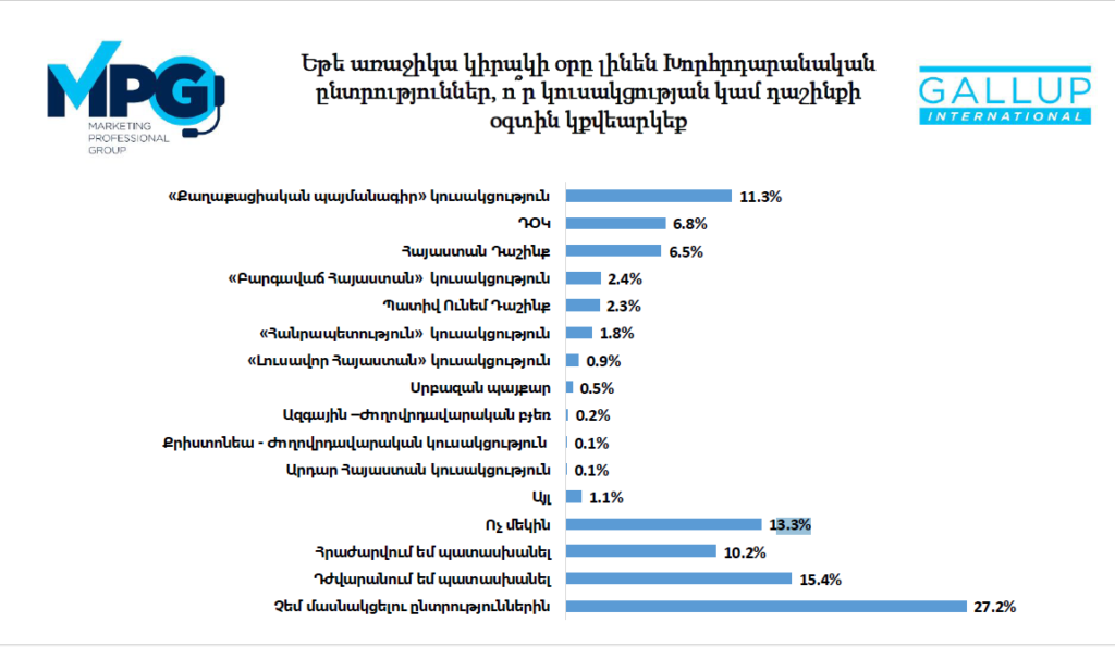 27.2%-ը նշել է, որ չի մասնակցի ընտրություններին, 15.4%-ը հրաժարվել է պատասխանել, իսկ 13.3%-ը ասել է, որ ոչ մեկին չի ընտրի։